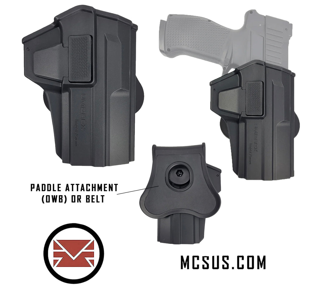 Includes an OWB (Outside-the-Waistband) paddle attachment that securely holds the holster against the waistband or can be worn with a belt.
