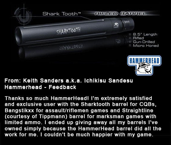 Shark Tooth™ - Our exclusive Shortie Rifled, Gun Drilled Barrel. The Hammerhead SharkTooth is a legendary shortie barrel perfect for the woods or a scenario event. With true spiral rifling for unmatched accuracy and ultimate consistency. This barrel kit is 11 inches long, measuring from end to end with the barrel and muzzle