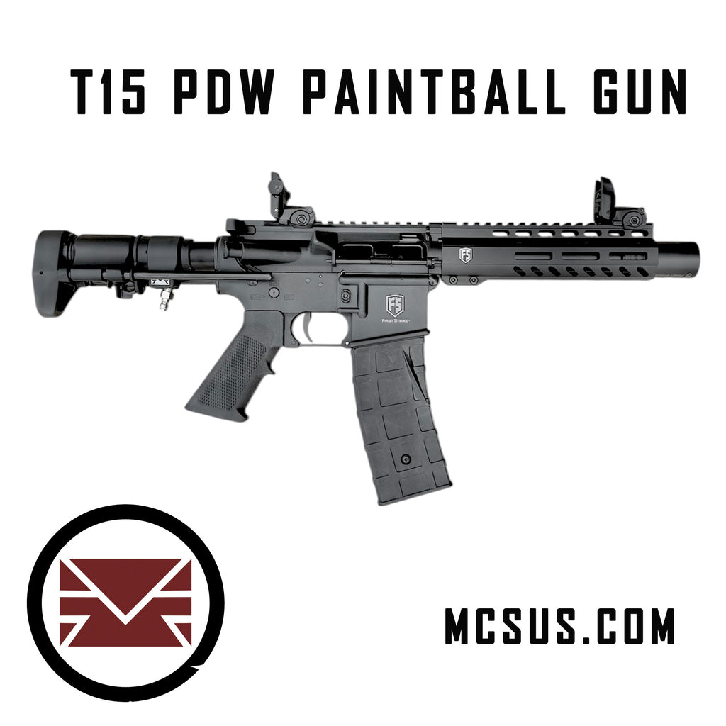 The First Strike T15 PDW – for ultimate close-quarters action. The FS T15 PDW utilizes the T15 magazine-fed paintball marker, the industry-leading true .68 caliber 1 to 1 AR rifle platform, and comes with high-end accessories to build out our favorite load out yet. The T15 PDW features a rugged lightweight aluminum body that will withstand the harshest conditions while maintaining optimum maneuverability, mil-spec collapsible stock, 7″ floating hand guard, Smooth Bore Barrel, and our popular LVOA Barrel Tip.